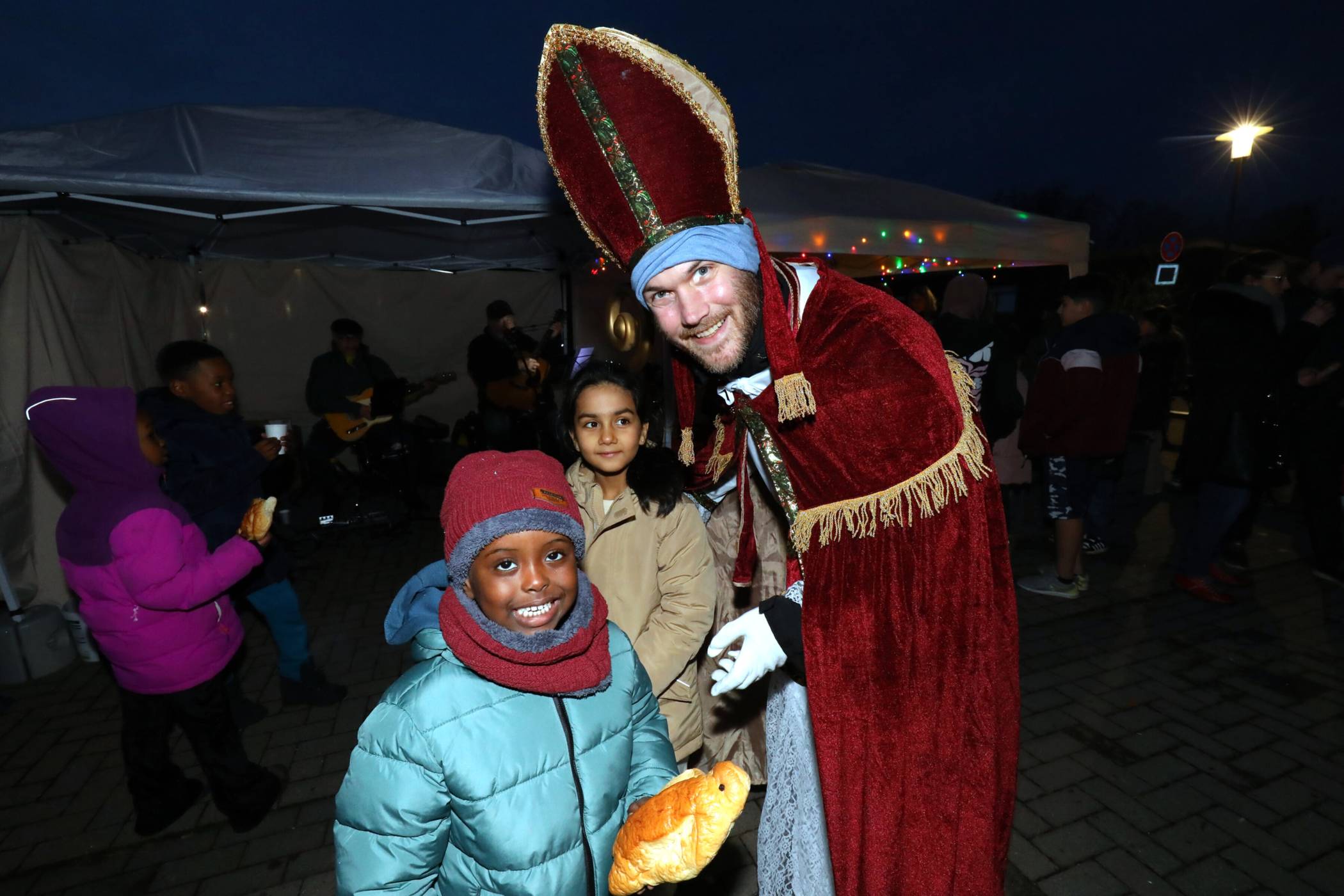 Nikolaus – verkörpert von Michael Sonntag – mit Juas und Haifa: Am Küvenkamp hatte die Flüchtlingshilfe zu einer vorweihnachtlichen Feier eingeladen. Foto: Armin Fischer (arfi)